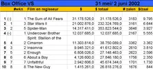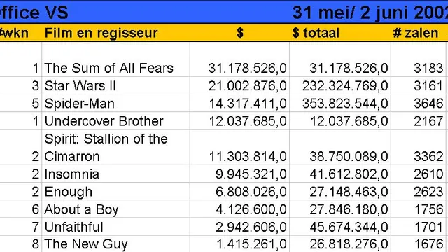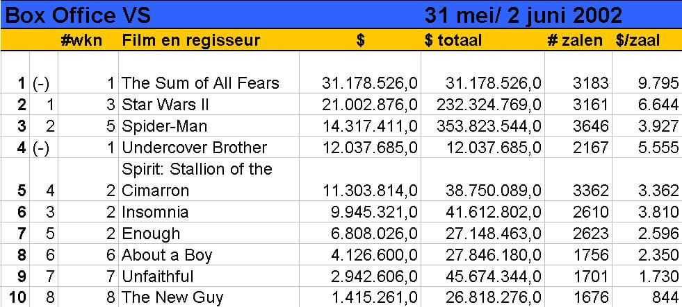 Drie weken na de release van de vijfde Star Wars-film gaat het er weer wat normaler toe in de Amerikaanse Box Office Toptien. Star Wars: Episode II is netjes een plaats opgeschoven voor een nieuwe film, Phil Alden Robinsons The Sum of All Fears. The Sum of All Fears is de vierde film rond Tom Clancy's CIA-agent Jack Ryan, na The Hunt for Red October, Patriot Games en Clear and Present Danger. Ryan neemt het dit keer op tegen een bende Derde Wereld-terroristen die een atoombom wil gooien op het stadion van Baltimore. The Sum of All Fears is door de critici gemengd ontvangen. Zo had menig journalist grote moeite met Ben Affleck in de rol van Jack Ryan. De invloedrijke Roger Ebert vindt evenwel dat Robinson een even spannende als realistische film gemaakt heeft. Het happy end neemt hij graag op de koop toe: dat is door de herinnering aan 11 september nu eenmaal onvermijdelijk geworden. 'If anybody ever makes a movie like this without the obligatory Hollywood softeners, audiences might flee the theater in despair.' Tweede binnenkomer (op nr. 4) is Undercover Brother, het komische debuut van regisseur Malcolm Lee. Eddie Griffin (in Nederland momenteel te zien in John Q) neemt met een uitzinnig Afro-kapsel de hoofdrol voor zijn rekening in deze Shaft-parodie. De pers kon er smakelijk om lachen, getuige de vele positieve recensies. 'Winningly silly,' schrijft de New York Times. 'A frequently inspired hit-and-miss burlesque that definitely hits more than it misses,' vindt Variety.