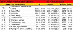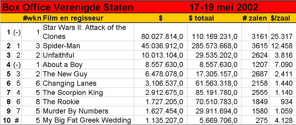 Twee nieuwe films deze week in de Amerikaanse Box Office Toptien, en het zal niemand verbazen welke van de twee direct naar de nummer 1 wist door te stoten. De aardige, maar weinig opzienbarende Nick Hornby-verfilming About a Boy was geen partij voor George Lucas' Star Wars II, ondanks de hoofdrol van Hugh Grant. De film kwam binnen op een vierde plaats. Star Wars II bleef met een entree van 80 miljoen dollar achter bij de 1e weekend-opbrengsten van Spider-Man (115 miljoen) en Harry Potter (90 miljoen). Wereldwijd deed de film het uitstekend, en dan vooral in Duitsland en Groot-Brittannië. De vorige Star Wars, Episode I: The Phantom Menace, bracht in het eerste weekend een kleine 65 miljoen dollar op, en had vijf dagen nodig om de 100 miljoen dollar-grens te bereiken. The Phantom Menace staat momenteel op de 4e plaats in de lijst met de meest succesvolle films in Noord-Amerika. Opmerkelijk is de nummer 10 van deze week: de low-budget komedie My Big Fat Greek Wedding, over de integratieproblemen van een Griekse vrouw en haar familie als gevolg van haar huwelijk met een Amerikaanse man. De film draait al vijf weken in de Amerikaanse bioscopen, en stond vorige week op een 11e plaats.