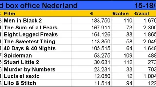 De Nederlandse bioscopen presenteerden het afgelopen weekeinde een redelijk aantal nieuwe (en kwalitatief arme) films. Hoogste binnenkomer was Sum of all Fears. Soms lijkt Ben Affleck, na James Baldwin (The Hunt for Red October) en Harrison Ford (Patriot Games en Clear and Present Danger) de derde acteur die de rol van CIA-agent Jack Ryan speelt, net Kuifje in het Pentagon, maar terroristen opruimen doet het goed in de bioscopen.