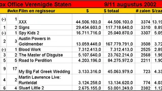 Een fascinerende titel op de eerste plaats van de Amerikaanse Box Office Toptien. XXX klinkt experimenteel, of naar een publieksonvriendelijke portie seks. In feite gaat het hier om een op en top commercieel product van het team achter The Fast and the Furious. Rob Cohen regisseerde deze platvloerse spionagefilm en Vin Diesel mocht het ruige antwoord geven op James Bond. Vakblad Variety omschrijft XXX als 'less a movie about an extreme sportsman-turned-James Bond- than it is a brawny commercial attraction strategically tapping into the auds for extreme sports, spy pix, thrill rides, popcorn actioners and anyone looking to see Diesel kick butt, blow stuff up and/or take his shirt off.' U bent gewaarschuwd.