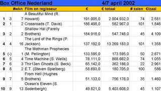 Slechts één nieuwe film in de meest recente Toptien: de bovennatuurlijke thriller The Mothman Prophecies van Mark Pellington (Arlington Road). De film kwam voorzichtig binnen op nummer 5.