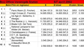 De honkbal-familiefilm The Rookie (met Dennis Quaid) kwam binnen op 3, terwijl derde nieuwkomer Clockstoppers het moest doen met de vijfde plaats. Een betonnen bunker is blijkbaar stukken interessanter dan een horloge dat de tijd stopzet. De vierde nieuweling, Danny DeVito's zwarte komedie Death to Smoochy, maakte zijn entree op 7.