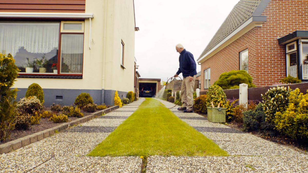 Nederlanders hebben hun gazonnetje graag keurig en onkruidloos, en om dat te bereiken gaan ze ver. De jonge regisseur Rashel van der Schaaf neemt in haar korte film De stand van het gras het Nederlandse tuinlandschap onder de loep. De documentaire bereikt zijn absurdste moment wanneer we zien hoe tuinmannen een gigantische, net-echte plastic grasmat installeren bij een klant. De vrouw des huizes, in rustieke outfit met hoed, bretels en laarzen, is verguld met het resultaat: ‘Héél gaaf zo.’ Een egeltje hupst even later over het plastic. De stand van het gras is echte slow-tv, met veel beeld en weinig tekst. Ondanks die minimalistische opzet slaagt de korte film er toch in je aan het denken te zetten over die toch wel allervreemdste diersoort: de mens, die de natuur tot in het bizarre probeert te temmen en na te maken.