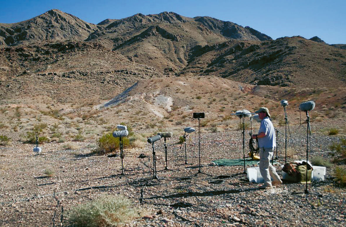 Het opnemen van pistoolschoten is een kunst. De magie van het geluid wordt voornamelijk gemaakt door de echo’s uit de omgeving. De voorwerpen waar de knal tegenaan stuitert, zodat je na de ‘beng’ ook nog een ‘pfiew’, een ‘poef’ of een ‘sssh’ hoort. Maynes: ‘Ik denk dat je altijd een omgeving in een geluid moet hebben. Zodat het ademt.’ Dat omgevingsgeluid is veel zachter dan de aanvankelijke knal. De kunst is dus om de knal zo op te nemen dat de microfoons het aankunnen, terwijl ze tegelijkertijd ook het staartgeluid op kunnen vangen. Om zeker te zijn dat hij het volledige geluid goed op de band krijgt, gebruikt Maynes meerdere microfoons. Bij ieder schot gebruikt hij twaalf tot zestien kanalen. ‘Sommige microfoons richt ik direct op het geluid. Andere microfoons staan anders gericht. Het is een kwestie van verschillende microfoons, de richtingen en de afstanden waarop ze staan, die de kwaliteit van het eindproduct bepalen. Het is een vreemde kunst.’