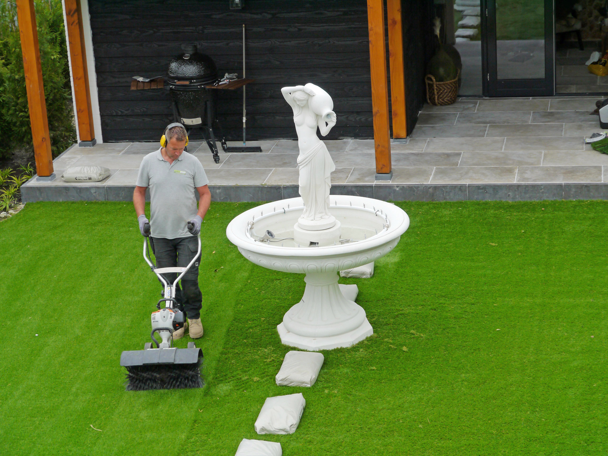 De documentaire bereikt zijn absurdste moment wanneer we zien hoe een gigantische, net-echte plastic grasmat geïnstalleerd wordt in een ruime tuin rond een al net zo ruim huis. Een paar montere tuinmannen snijden hem – met een tergend scheurgeluid – op maat. ‘Nagenoeg geen onderhoud, het is enkel misschien aan de zijkant dat je een keer een onkruidje krijgt,’ zegt een van de tuinmannen trots. De vrouw des huizes, in rustieke outfit met hoed, bretels en laarzen, is dan ook verguld met het resultaat: ‘Héél gaaf zo.’ De dieren in de tuin kijken ondertussen verwonderd toe. Een egeltje hupst even later over het plastic.