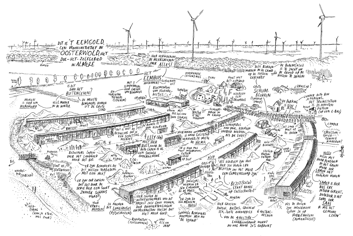 Dankzij doe-het-zelf-gebiedsontwikkeling heeft het poldergebied Oosterwold bij Almere een totaal ander karakter gekregen dan de rest van de stad, die op de tekentafel is ontstaan. Het grootste project op Oosterwold moest ’t Eemgoed worden: een uit 82 woningen en een gemeenschapshuis bestaande minisamenleving op vijftig hectare nieuwe natuur. Dromers en ook doeners Sant en Solange Ruyter namen in 2017 het initiatief voor ’t Eemgoed. De projectontwikkelaars misten samenhang in de maatschappij en wilden die bewerkstelligen op eigentijdse dorpslandgoederen: georganiseerd noaberschap in een nieuw te bouwen dorpje. De droom van de Ruyters bleek een gat in de markt, want de vraag naar verbinding en een huis was veel groter dan het aanbod.