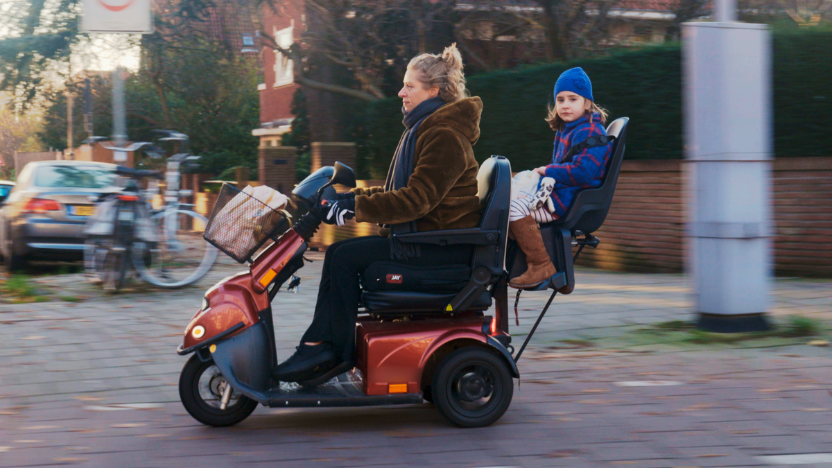 Tegenwoordig loopt de jonge Sanne als een kievit, maar wel alleen binnenhuis. Door een spieraandoening kreeg ze een scootmobiel waar ze niet in wilde rijden. Haar vriend haalde haar over. Nu is ze met haar tweepersoons-scootmobiel een bijzondere verschijning. Het kinderzitje achterop zorgt ervoor dat ze haar dochtertje overal naar toe kan brengen.