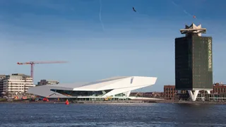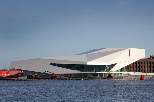 Er is een majesteitelijke witte vogel neergestreken op de oevers van het IJ. Of is het een haai, met de overstekende pui als bek, en dat ene raam als oog? De schipper van de pont naar Noord houdt het op ‘de UFO’. Dat laatste is goed getroffen: in de grijze skyline van Noord is EYE inderdaad van een haast buitenaardse schoonheid .