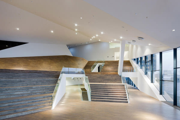 Binnen word je naar het hart van het gebouw geleid , de ‘arena’: een grootse ruimte, die uitnodigt tot herademen. Links biedt een glaswand weids uitzicht op water en stad; het deels verlaagde plafond zorgt in de grote ruimte toch voor intimiteit. Hier begint en eindigt straks een filmavondje of dagje EYE: de arena geeft toegang tot alle zalen, exposities en andere functies van het gebouw. ‘Je hebt hier overzicht, dat is prettig. In EYE draait alles om de bezoeker; niet de architectuur, maar de mens staat voorop.’