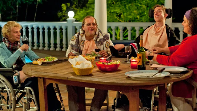 Zo politiek correct als bovenstaande zin is de film gelukkig niet. Philip, een eigenwijze snotneus die vrijwel volledig verlamd is, is namelijk verfrissend direct. ‘Ik wil poepen!’ (=Vlaams voor neuken), roept hij door het revalidatiecentrum. Het is dan ook zijn idee om naar het Spaanse bordeel te gaan, ‘een luxe hoerenkot, speciaal voor gasten als wij.’