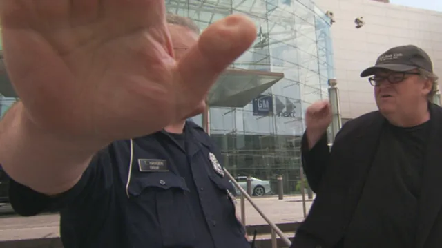 Met handig en vooral grappig aan elkaar gesneden archiefmateriaal geeft Moore commentaar op en illustreert hij de in zijn fi lms verkondigde stellingen en meningen. En hoewel een stoet mensen voorbij trekt is het vaak Moore zelf die de hoofdrol speelt. In zijn eerste documentaire Roger and Me (1989) probeert hij een fi lm lang vergeefs Roger Smith, de directeur van General Motors, te spreken te krijgen. Telkens weer wordt hij van het kastje naar de muur gestuurd, wat vaak hilarische beelden oplevert. Sindsdien loopt Moore – hij hoopt dat ze hem de weg zullen versperren, begin je te vermoeden – in elke documentaire tegen dichte deuren en barse beveiligers aan.