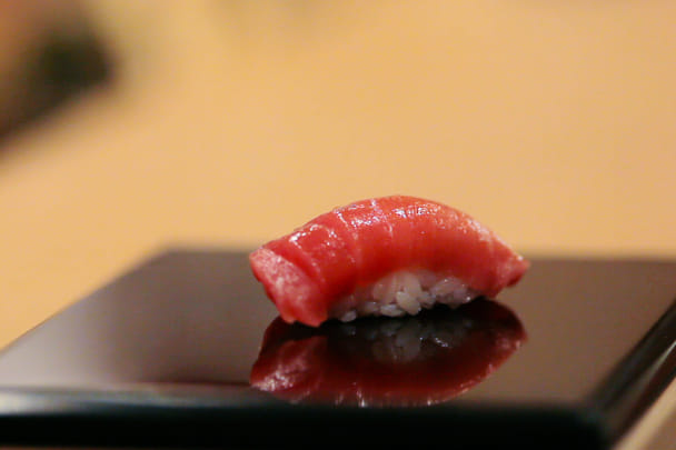 Niettemin ontgaat fijnproever noch estheet de sobere elegantie van een tafel met gyoza, wakamesalade, yakitori en de pot groene thee. Van een rechthoekig bord met daarop die geraffineerde rauwe-vis-op-rijst-sculptuurtjes. Een perfect uitgevoerde gunkan ikura – ovaal noribootje gevuld met rijst en zalmeitjes – is het sushipendant tot een haiku of een reeks karakters in shodo, Japans schoonschrift. Alle franje is er als het ware in verzonken om tot de essentie van vorm, textuur en smaak te komen.