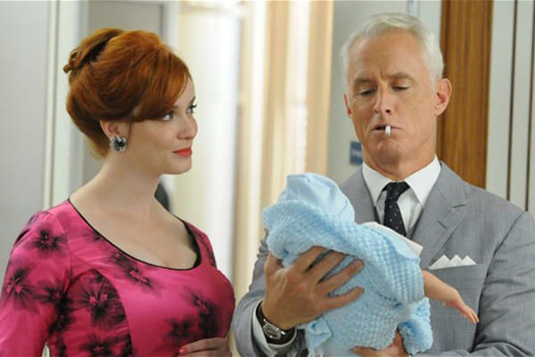 Als er één vrouw is die een stijlicoon werd sinds Mad Men ons verrukt met jarenzestigkapsels en vrolijk ratelende typemachines, is het wel de rondborstige , roodharige secretaresse Joan Holloway. Actrice Christina Hendricks prijkte inmiddels op de cover van menig damesblad, zo van: moeten we niet terug, in deze tijd van graatmagere topmodellen, naar de vrouwelijkheid van Joan? Ze heeft niets op met de ambitie van Peggy, de vrouwelijke copywriter die tegen de klippen op wil uitblinken in een mannenwereld. Maar onder haar inschikkelijke rol en klassiek feminiene verschijning gaat een ijzersterke vrouw schuil die, zo blijkt aan het begin van seizoen 5, niet in staat is thuis te zitten met haar baby.