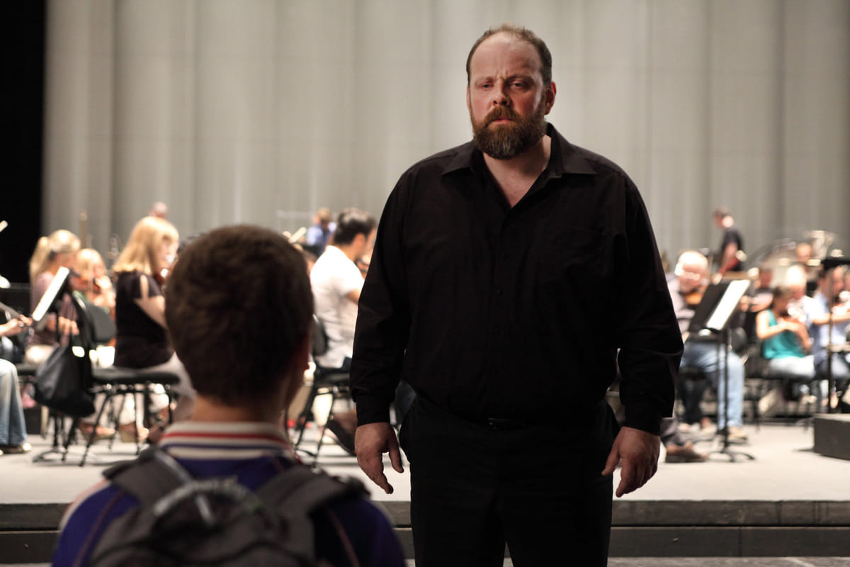 Een scène die veel indruk op me maakte, juist omdat hij zo klein bleef, was die waarin Victor stiekem naar een repetitie van zijn vader komt kijken. Victor wordt er bijna uitgeknikkerd, waarop hij liegt dat hij er voor een werkstuk is. Ze vragen hem waarover, en dan zegt zijn vader bijna terloops: ‘Over mij.’ Prachtig, want dat is het moment waarop hij hem als zijn zoon erkent. Hoe regisseer je zo’n scène?