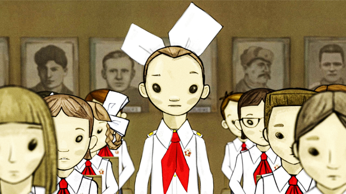‘In onze film versterkt de liveaction alles wat we in de animatie zien: het benadrukt dat wat we daar zien echt gebeurd is. Dat het geen fantasie is, maar geworteld en gedocumenteerd in de werkelijkheid. Daarom laat ik in de geanimeerde stukken op mijn school ook beelden zien uit de oorlogsfilms die we destijds – we waren een jaar of acht – moesten bekijken. Heel bloederige films waar ik nachtmerries van kreeg. De juf die ons destijds lesgaf was een echte hardliner. En erg autoritair. Ze sloeg ons in de klas en kinderen piesten letterlijk in hun broek van angst wanneer ze tegen hen tekeer ging. Die juf wordt met naam en toenaam genoemd in de film, maar daar voel ik me niet slecht over, want zij was veel slechter. Zij heeft ons destijds echt getraumatiseerd. En om de kijker emotioneel te laten beleven wat ik toen gevoeld heb, had ik de animatie nodig. Want daar zijn geen beelden van. Ook niet van hoe het leven toen echt was in de Sovjet-Unie, want dat mocht nooit getoond worden. Alles wat niet in het propagandaplaatje paste werd verzwegen. Door de mix van liveaction en animatie kon ik de werkelijkheid van twee kanten benaderen.’