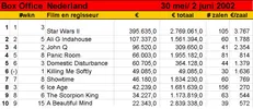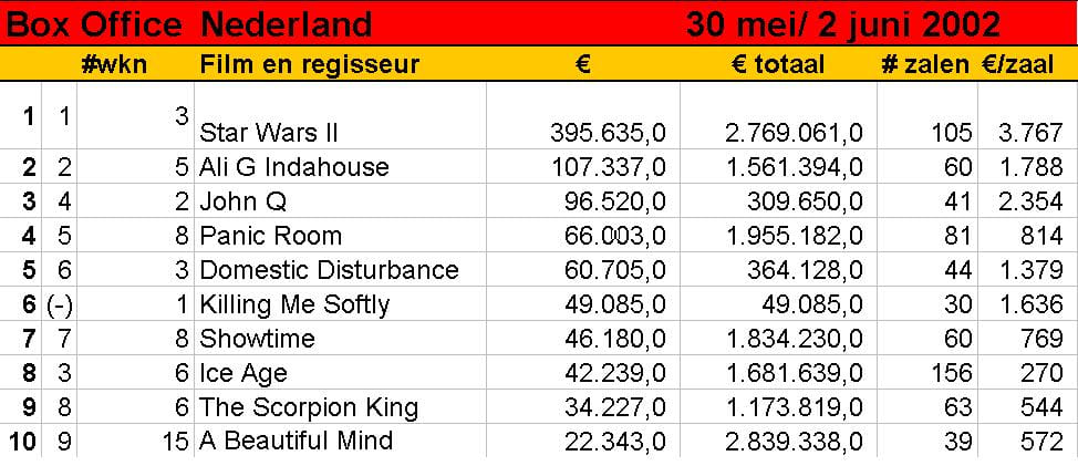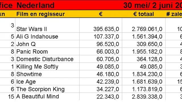 Terwijl Star Wars II in Amerika het veld alweer moest ruimen, prijkt de film in Nederland na drie weken nog steeds op de eerste plaats. De enige nieuwe binnenkomer wist in zijn eerste weekend niet verder te komen dan de zesde plaats. Misschien bij gebrek aan iets beters, als we David Sneek mogen geloven: 'een formulefilm met obligate seks, voorspelbare schijnbewegingen en een knullige ontknoping', zo schrijft hij in De Volkskrant en op deze site.