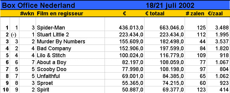 Na drie weken staat Spider-Man nog steeds op nummer 1 in de Nederlandse Bioscoop Toptien. Zoals wel te verwachten viel van deze menselijke superheld. De tweede film rond pratende muis Stuart Little - volgens recesente Pauline Kleijer 'knap technisch vertoon, ten dienste van een charmant verhaal'- deed het in zijn eerste week ook alleraardigst. Het tekenfilmepos Spirit van Disney-concurrent DreamWorks doet het sinds zijn release vorige week maar magertjes: de film kwam binnen op negen en is afgelopen weekend gezakt naar de tiende plaats. 'Het probleem van serieuze DreamWorks-animatie is het gebrek aan humor en relativering. Ook Spirit lijdt daaraan.' Wellicht wijst recensent Ronald Ockhuysen met deze kritiek op de oorzaak van Spirit's matige succes.