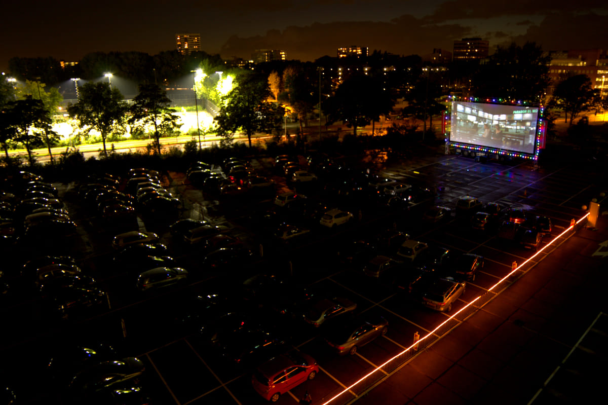 De jaarlijkse Drive-In bioscoop op het parkeerterrein van het Holland Casino in Utrecht waar dit jaar de film Taped werd vertoond.