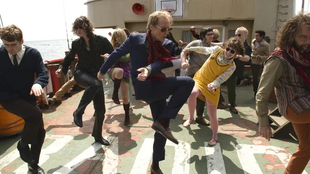 ‘De dag dat we met zijn allen moesten dansen. Het werd toen een soort Elvis Presley- film. Overal op het dek dansten acteurs op Dancing in the Street van Martha and the Vandellas. De zee was kalm, de zon scheen, en ik herinner me nog hoe Philip Seymour Hoffman, die daarvoor in een handvol tamelijk serieuze films had gespeeld, op het poop deck stond te rocken alsof zijn leven er vanaf hing. Hij zag eruit als de gelukkigste man op aarde. Dat was zo’n dag waarop je denkt, dit is de reden waarom ik ooit besloot acteur te worden. Je dobbert op het water, luistert naar fantastische muziek, en je wordt betaald om een potje te gaan dansen.’