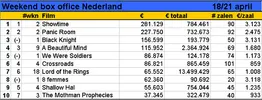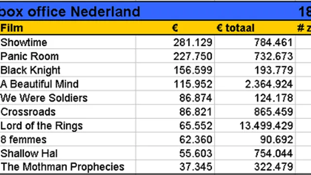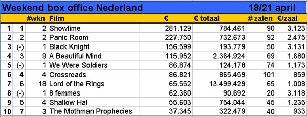 Ondanks een bescheiden achtste plaats in de box-office toptien is het eerste weekend van 8 femmes een succes te noemen. Als naar opbrengst per scherm wordt gekeken, dan doet de film van de Franse regisseur François Ozon niet onder voor de grote Hollwyood-producties. In die categorie staat 8 femmes tweede (3.118 euro per scherm) achter Black Knight (3.131), maar voor bijvoorbeeld Showtime (3.123). De komedie met Eddie Murphy en Robert DeNiro staat voor de tweede week op de hoogste plaats in het klassement, opnieuw net voor Panic Room van David Fincher. Black Knight, de deze week uitgekomen komedie met Martin Lawrence in de hoofdrol, bezet de derde plek. De derde nieuweling in de toptien is We Were Soldiers, de Vietnamfilm met Mel Gibson. Een verpletterende binnenkomst maakte de film niet. Een vijfde plek is geen afgang, maar per zaal haalt Gibson minder geld binnen dan oudere films als From Hell, Th13teen Ghostst en Shallow Hal.