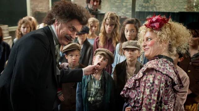 Hij wil graag naar school, maar wordt daarbij tegengewerkt door de kinderuitbuitende weeshuisdirectrice (Martine Sandifort): met mankebeen en pruik een platte imitatie van Miss Hannigan uit Annie (1982). Haar handlanger Tibor wordt gespeeld door Loek Peters met een rare kalende kop, pukkel en plakneus.