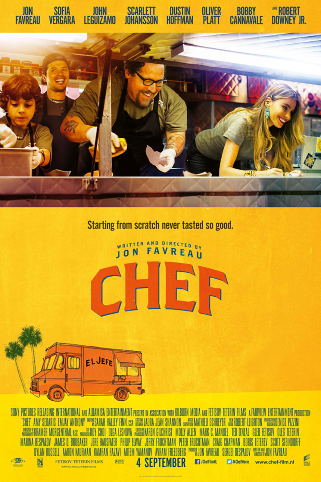 Het verhaal stoelt te veel op herhaling, eindeloos geleuter en uitleg van plot, gevoelens en social media. In combinatie met steeds hetzelfde saaie shot van het huis van Casper's ex-vrouw (Modern Family-ster Sofia Vergara) lijkt Chef wel een als sitcom-on-wheels vermomde cursus Social Media Voor Dummies. Met als grootste euvel het matte optreden van Favreau, die zich met deze film vooral bewijst als de crowdpleaser die hij is geworden. Daar doen de bijrolletjes voor de zwoele Scarlett (Black Widow) Johansson en de chronisch hyperende Robert (Iron Man) Downey jr. niet aan af. Wat Favreau als ' authentiek' voedsel beschouwt – geroosterd wit brood met veel vlees, mosterd en boter – heet aan deze kant van de oceaan gewoon fast food, ook al is het dan met de hand gemaakt.