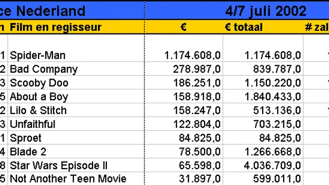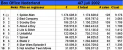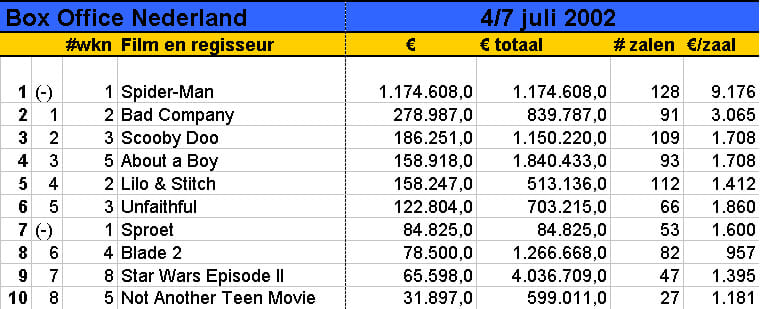 De film Spider-Man van regisseur Sam Raimi verovert na Amerika ook Nederland. De stripverfilming trok donderdag op de Nederlandse premièreavond ruim 40.000 bezoekers. Dit heeft distributeur Columbia Tristar vrijdag bekendgemaakt. De opbrengst bedroeg 259.283 euro waarmee de vorige recordhouder, Harry Potter and the Philosopher's Stone, van de eerste plaats werd gestoten. Opmerkelijk is dat Spider-Man met slechts de helft van het aantal kopieën van Harry Potter in de bioscopen draait. De tovenaarsjongen behaalde zijn record met 243 kopieën, terwijl Spider-man in 128 theaters te zien is. Eerder brak de rolprent in Amerika alle records. De eerste drie dagen bedroeg de opbrengst daar 114 miljoen dollar (125 miljoen euro), waarmee ook het oude record van Harry Potter (90,3 miljoen dollar) werd overtroffen. De enige andere nieuwe binnenkomer is Ben Verbongs Sproet, een jeugdkomedie met SF-trekjes. De film werd in Duitsland gemaakt en trok daar bijna twee miljoen bezoekers. Het is nu afwachten of dat succes zich in Nederland gaat herhalen. (bron: ANP)