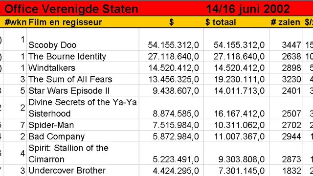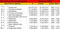 'Here's a classic example of a movie that didn't need to be made,' zegt Claudia Puig van USA Today over Scooby Doo. Het Amerikaanse publiek dacht daar blijkbaar anders over, en verkoos de verfilming van de klassieke tekenfilmserie boven de Ludlum-thriller The Bourne Identity en de nieuwe John Woo, Windtalkers. In de traditie van Who Framed Roger Rabbit en Mary Poppins gaat in Scooby Doo 'live action' samen met animatie: de pratende Deense dog komt rechtstreeks uit de computer, maar wordt bijgestaan door een team van schmierende acteurs. Volgens Roger Ebert een slechte keus: ' Scooby-Doo so thoroughly upstages the live actors that I cannot understand why Warner Bros. didn't just go ahead and make the whole movie animated'. In The Bourne Identity speelt Matt Damon een aan het strand gespoelde man zonder geheugen, die de spil blijkt van een internationaal spionagecomplot. De kritieken zijn behoorlijk lovend: op het commentaar afgaande is The Bourne Identity een intelligente, maar ook vrije en vooral op aktie drijvende bewerking van het gelijknamige boek van Robert Ludlum. De film betekent de volgende stap in de Amerikaanse carrière van Franka 'Lola rennt' Potente. Volgens E! Online is de chemie tussen haar en Damon 'très bien'. John Woo's Windtalkers tenslotte behandelt een ongewoon aspect van de Amerikaanse WO II-geschiedenis. In hun strijd tegen de Japanners zetten de Amerikanen enkele Navajo-indianen aan het werk, om belangrijke militaire boodschappen in hun taal te verzenden en het antwoord te decoderen. Nicholas Cage en Christian Slater spelen de bodyguards die de Navajo's op hun missie begeleiden. Windtalkers kreeg vrijwel uitsluitend slechte kritieken. Zo vindt Ella Taylor van LA Weekly de film 'a string of incrementally orgiastic battle scenes glued together with enough sap to make Steven Spielberg look like a cynic'.