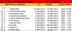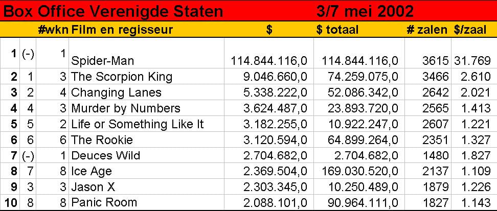 De Amerikaanse première van Spider-Man liep door allerhande problemen tijdens de productie en de aanslagen van 11 september flinke vertraging op, maar afgelopen weekend was het dan eindelijk zo ver. Al het uitstel lijkt de makers geen windeieren te hebben gelegd: de film heeft van vrijdag tot en met zaterdag het recordbedrag van ruim 114 miljoen dollar opgeleverd. Daarmee is het oude record van Harry Potter and the Philosopher's Stone verbroken. Die film bracht in zijn eerste drie dagen 90,3 miljoen dollar in het laatje. Spider-Man brak ook het record van hoogste bezoekersaantal per dag, dat eveneens op de naam van de tovenaarsleerling stond. De film over de spinachtige superheld bracht zaterdag 43,7 miljoen dollar op, terwijl het record van Harry Potter op 33,5 miljoen dollar stond. Spider-Man komt in Nederland op 4 juli uit. De enige andere nieuwe film in de Amerikaanse Toptien is het misdaaddrama Deuces Wild van Scott Kalvert. Kalvert maakte in 1995 zijn voorlaatste film: toen kwam hij met het integere The Basket Ball Diaries, een van de films die de opstap naar Hollywood betekenden voor Leonardo DiCaprio. Deuces Wild heeft Stephen Dorff en Brad Renfro in de hoofdrollen, maar die net-niet- echt grote sterren konden niet voorkomen dat de film binnenkwam op een magere zevende plaats. (bron: ANP)