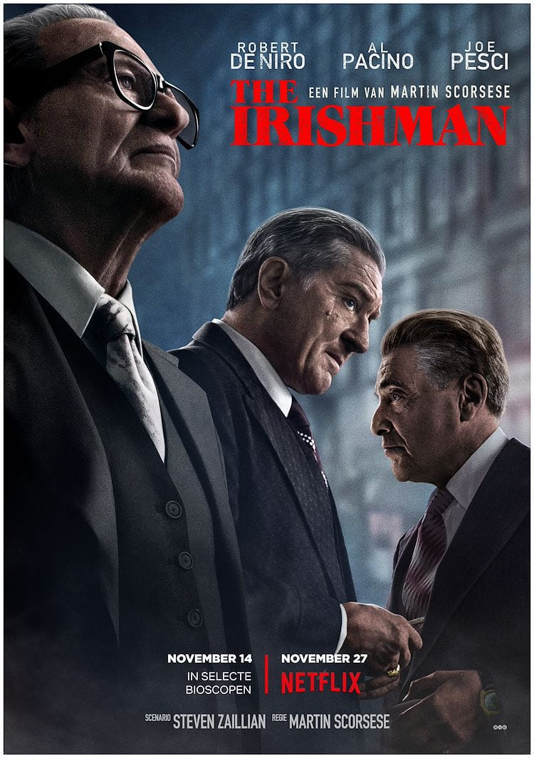 Dat prijskaartje, en daarbij opgeteld het recreëren van het verleden, bleek te hoog voor Hollywoodstudio Paramount, die zich in 2017 – toen de kosten zich begonnen op te stapelen – terugtrok. Waarop streaminggigant Netflix te hulp schoot en Scorsese een blanco cheque aanbood en vrij spel gaf. Scorsese accepteerde, maar de nieuwe broodheer liet onverlet dat hij het betreurde dat Hollywood hem de rug had toegekeerd. Vandaar zijn opmerking in Empire. Want films als The Irishman horen wat hem betreft nog steeds thuis op het grote scherm. Wat in Nederland overigens ook zal gebeuren, al is het maar even. Voordat The Irishman op 27 november te zien is op Netflix draait hij eerst in 47 bioscopen door het hele land.