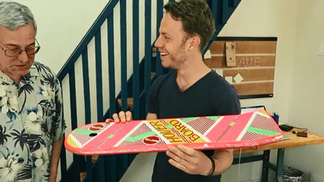 Tom Roes: ‘Toen Back to the Future II uitkwam, was 2015 echt ver in de toekomst. Het was zo cool om te bedenken hoe alles er dan uit zou zien. Wat zouden we allemaal hebben en kunnen? Wij zijn Back to 2015 gaan maken omdat we benieuwd waren naar de locaties en de acteurs nu. We ontmoeten het brein achter de film, rijden in een DeLorean door de stad en ontdekken een techniek voor het hoverboard: het zwevende skateboard. Het is net alsof je als kind op een camping bent ge- weest en dertig jaar later weer gaat kijken.’