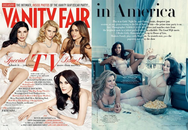 Met een speciaal televisienummer brengt Vanity Fair deze maand een ode aan het voorheen ordinaire zusje van de cinema, dat terug is in het centrum van de belangstelling dankzij de hausse aan kwaliteitsseries die al een paar jaar het scherm overspoelt. Vanity Fair vertaalt het nieuwe elan van televisie in weelderige fotoreportages vol glitter & glamour waarin een hele stoet personages gezellig samen voor de buis hangt, whisky en popcorn onder handbereik en lekker in pyjama - natuurlijk wel van zijde. Dexter zit gebroederlijk op de bank met Jesse Pinkman uit Breaking Bad; Kelsey Grammer, ooit Frazier, nu Boss, serveert een wijntje. Gooi er een betoog bij getiteld Prime Time’s Graduation en een smeuïge reportage over Newsroom, het opwindende nieuwe project van Aaron 'West Wing' Sorkin, en de boodschap is duidelijk: tv kijken is nu the thing to do.