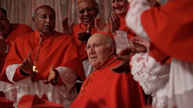 Binnen gaat de komedie verder. De stemming, waar Moretti langdurig bij stil staat, schiet alle kanten op. We horen de gedachten van de hoogbejaarde kardinalen. De favoriet die stiekem hoopt dat hij het niet wordt. Kardinalen die bij elkaar afkijken. Het lijkt wel een schoolklas.