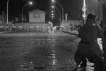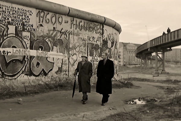 Het is een triest gezicht wanneer een oude dichter (Curt Bois) en de engel Cassiel (Otto Sander) langs de westkant van de Berlijnse Muur wandelen in Der Himmel über Berlin. Naast de Muur, die is volgekalkt met graffiti, ligt een metalen loopbrug. De dichter loopt over een drassig gebied, waar alleen nog een beetje gras groeit, en besluit dan om maar even te gaan zitten in een oude stoel die daar is weggegooid. De Muur staat symbool voor Wenders’ sombere beeld van Berlijn. In de film wordt dit beeld treffend verwoord door circusartieste Marion (Solveig Dommartin): ‘Berlijn. Ik ben hier een vreemdeling, maar toch is alles zo vertrouwd. Je kunt hier niet verdwalen, je komt altijd bij de Muur uit.’