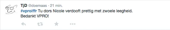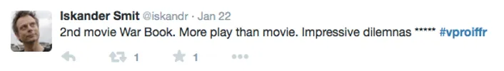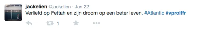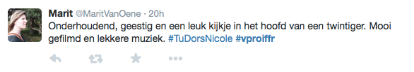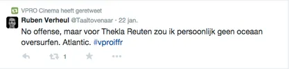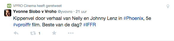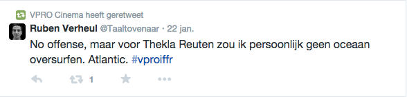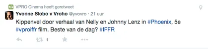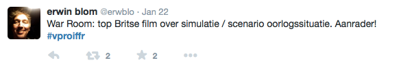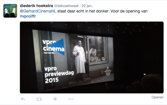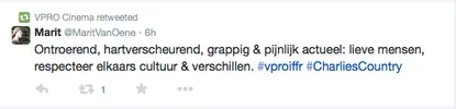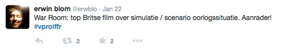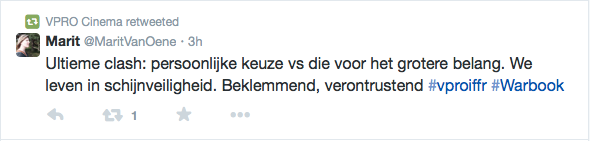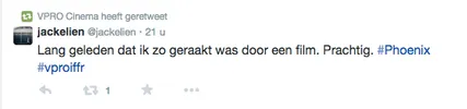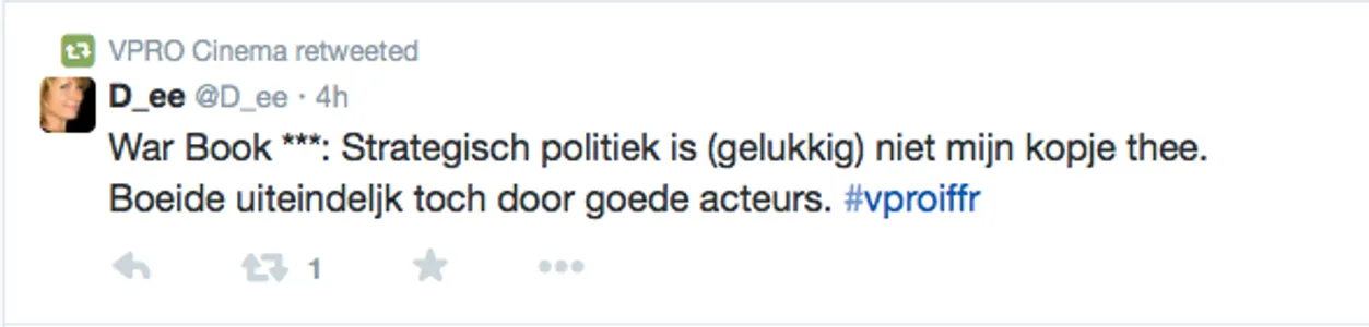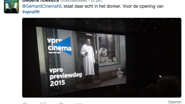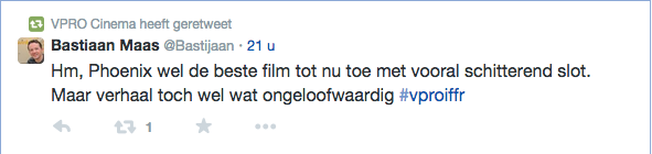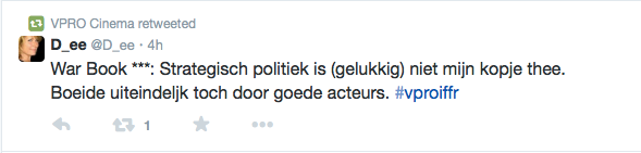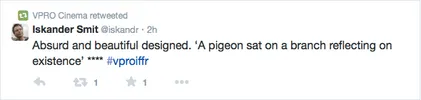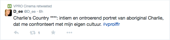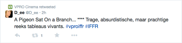 Films Nieuws VPRO Previewdag op twitter Een overzicht 23 januari 2015 Tijdens de VPRO Previewdag werd door bezoekers actief verslag gedaan op Twitter. Hier een kleine greep uit de reacties. Charlie's Country, Rolf de Heer War Book , Tom Harper A Pigeon Sat on a Branch Reflecting on Existence, Roy Andersson Atlantic, Jan-Willem van Ewijk Phoenix, Christian Petzold Tu dors nicole, Stephane Lafleur