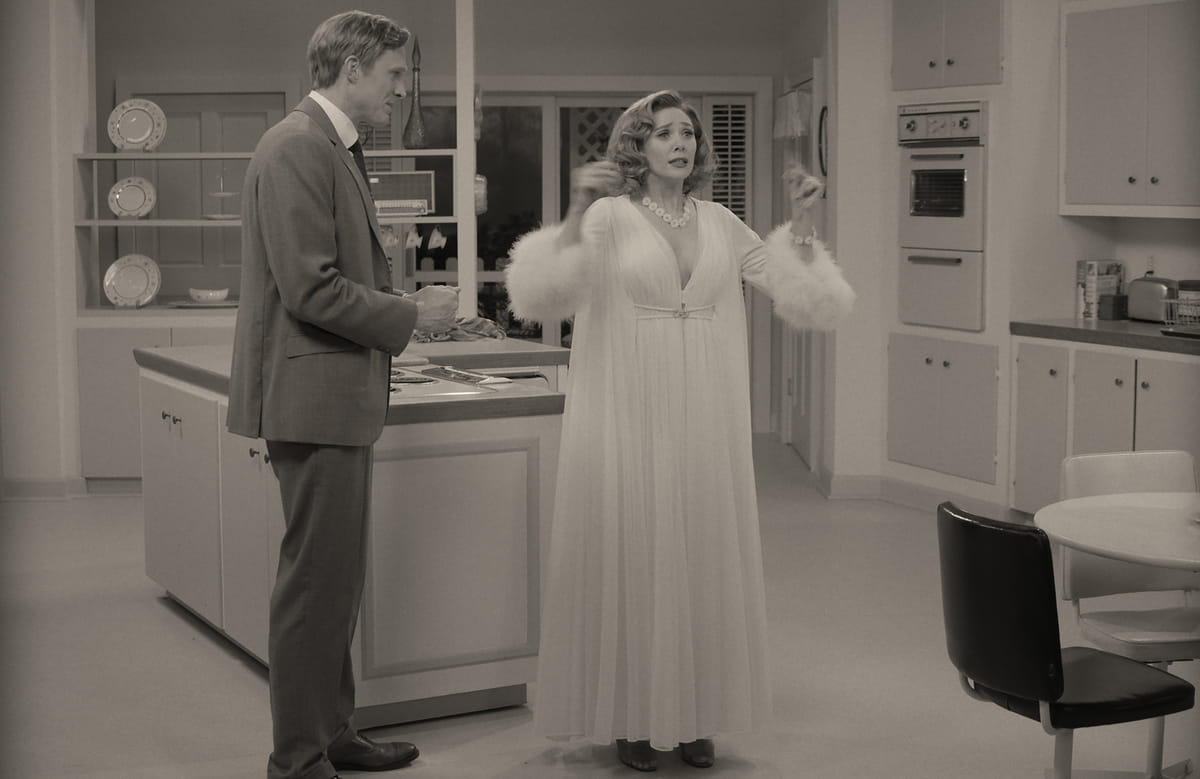 Maar wat WandaVision zo gewaagd maakt, is hoe ver de serie van het Marvel-stramien afwijkt. Hier worden geen steden door vechtende halfgoden met de grond gelijk gemaakt. De spectaculairste actie in de eerste aflevering is het moment waarop hoofdpersoon Wanda met haar heksenkracht een paar kreeften uit het raam laat vliegen. Dit omdat ze niet wil dat het bezoek - de baas van haar man Vision en zijn vrouw - ziet dat ze het diner voorbereidt door borden en pannen door de lucht te laten zweven.