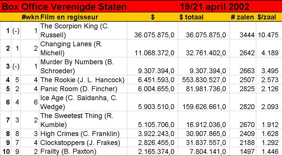 Slechts twee nieuwkomers deze week in de Amerikaanse Box Office Toptien. Chuck Russells spin-off van The Mummy, The Scorpion King, is direct op nummer 1 binnengekomen. Zoals het een met effecten beladen actiefilm betaamt. Verder heeft Barbet Schroeders thriller Murder By Numbers een derde plaats bemachtigd. Naar verluidt is het een aardige film over twee schoolmeisjes die de ene perfecte moord na de andere plegen, en zo in een kat- en muisspel belanden met een al even slimme FBI-agent. Schroeder (Single White Female) gokt hiermee weer op het grote publiek, na met La Virgen de los sicarios een wat experimentelere arthousefilm te hebben afgeleverd. Grootste zakkers zijn het Cameron Diaz-vehikel The Sweetest Thing en David Fincher's Panic Room, dat keldert van de tweede naar de vijfde plaats. Frailty, de sfeervolle serial killer-thriller waarmee acteur Bill Paxton zijn regiedebuut maakt, heeft de Toptien-grens na twee weken weer bereikt.