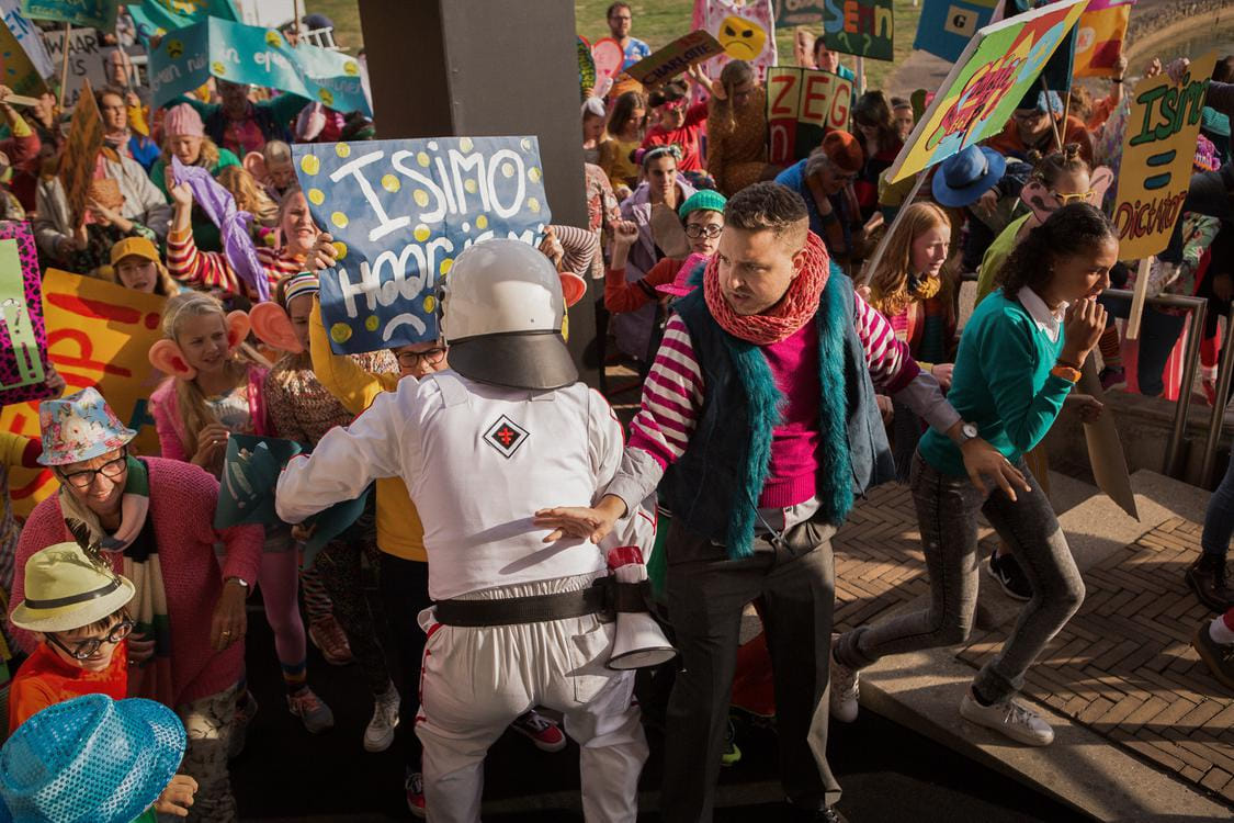 In de toekomst draagt iedereen grijs en worden lelijke kinderen afgevoerd naar een ‘opfriskamp’. Paul (Hulsmann), met flaporen, weet te ontsnappen en komt met twee vrienden in verzet tegen het koude bewind. Regisseur Elbers bewerkte eerder het boek van Koos Meinderts uit 1987 tot zijn eindexamenproject voor de Filmacademie. Deze dystopische jeugdfilm heeft een enthousiaste cast: Roeland Fernhout is leuk als de glimlachende president die een rigide politiek voert. Liefdevol gemaakte film over discriminatie en burgerlijke ongehoorzaamheid met goed gekozen locaties.
