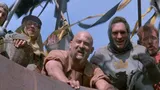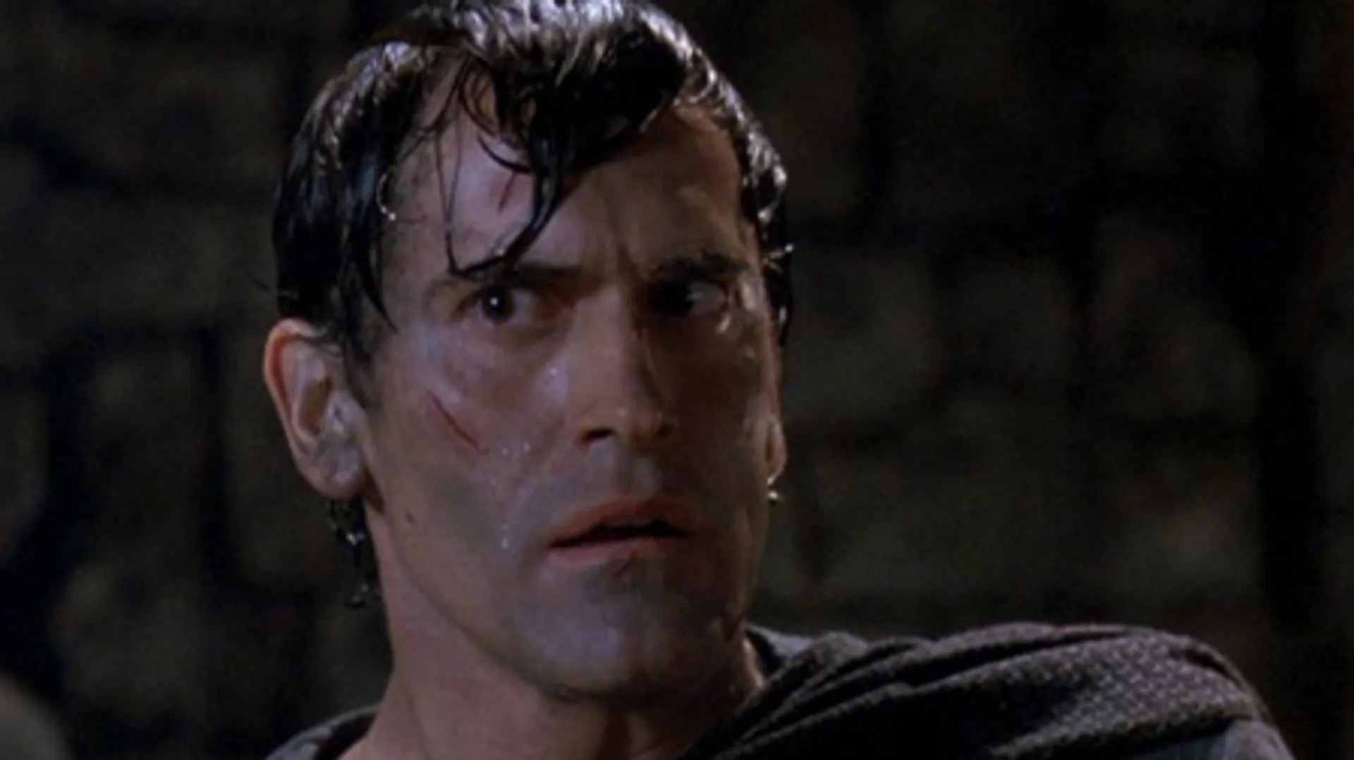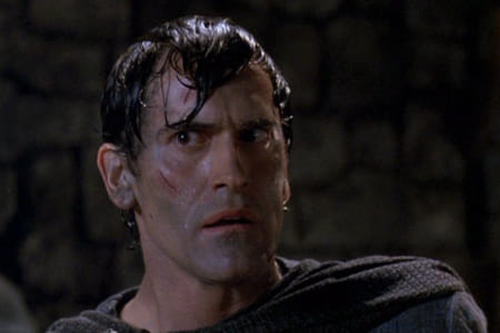 Warenhuisemployé Ash (Bruce Campbell) belandt met zijn befaamde kettingzaagprothese in de veertiende eeuw waar hij op onderkoelde wijze slag levert met ridders, zichzelf, allerhande gedrochten en een leger van skeletten. Regisseur Raimi kwam in Evil dead 2 nauwelijks toe aan zijn geliefde Middeleeuwen - deel twee was feitelijk een geniale remake van zijn origineel - en pakte voor deel 3 flink uit met bloedfonteinen, duistere magie en botte animatie. Maar het leukste blijven toch Campbells groteske mimiek en groovy teksten.