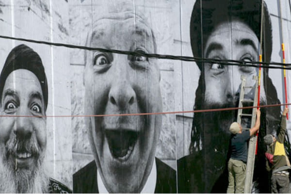 In Faces, het regiedebuut van Gérard Maximin alias Gmax, gaan de Franse kunstenaars JR en Marco, respectievelijk verantwoordelijk voor de foto's en het concept, naar het Midden-Oosten om onder het motto Face 2 Face de lokale bevolking aan weerszijden van het conflict in hilarische poses vast te leggen en op posterformaat in het openbaar te exposeren. Door de mensen zo met elkaar en zichzelf te confronteren, zou het wederzijdse begrip moeten toenemen.