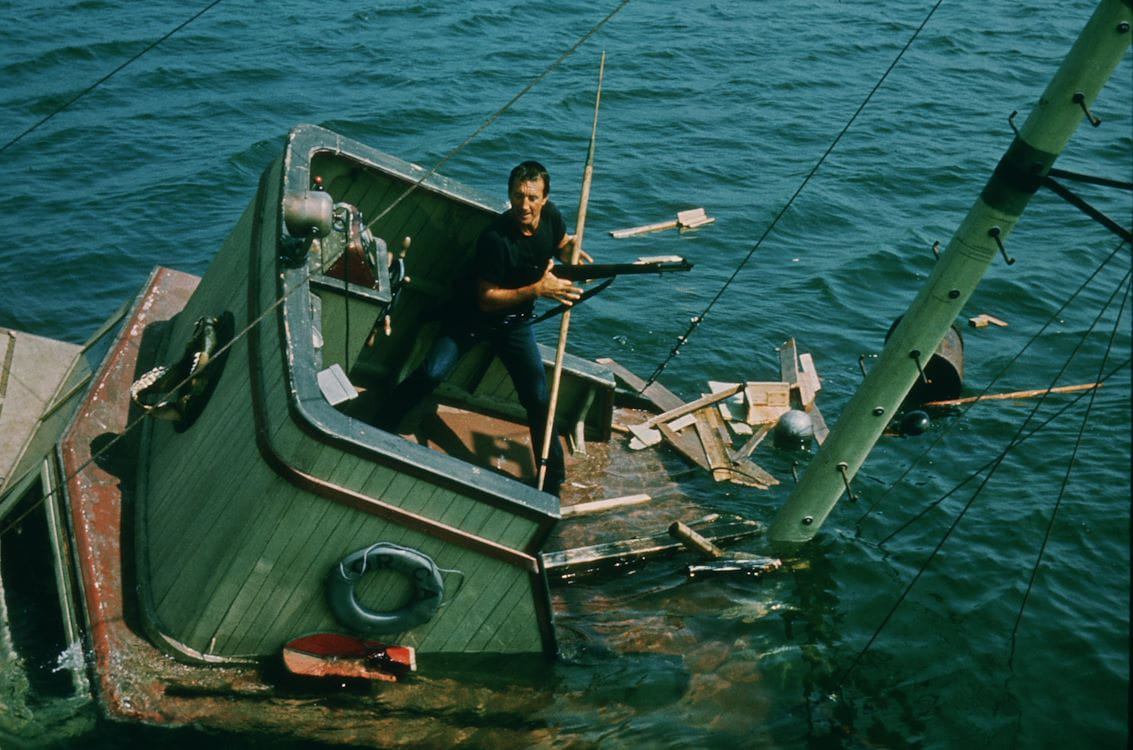 Een badplaats wordt geterroriseerd door een grote witte mensenetende haai, die al verschillende slachtoffers heeft gemaakt. De burgemeester weigert het strand te sluiten. Sheriff Brody (Scheider) bindt dan, geholpen door een bioloog en een ruwe zeebonk, zelf de strijd aan met het monster. Op zee, terwijl hij eigenlijk watervrees heeft. Ruim een uur krijgen we de haai zo goed als niet te zien, wat niet erg is, want de mechanische haai Bruce zag er naar de huidige maatstaven niet erg realistisch uit. Verder is Jaws nauwelijks gedateerd, slim opgebouwd, briljant gefilmd en prima geacteerd. Oscar voor de montage en voor de uitstekende muziek van John Williams.