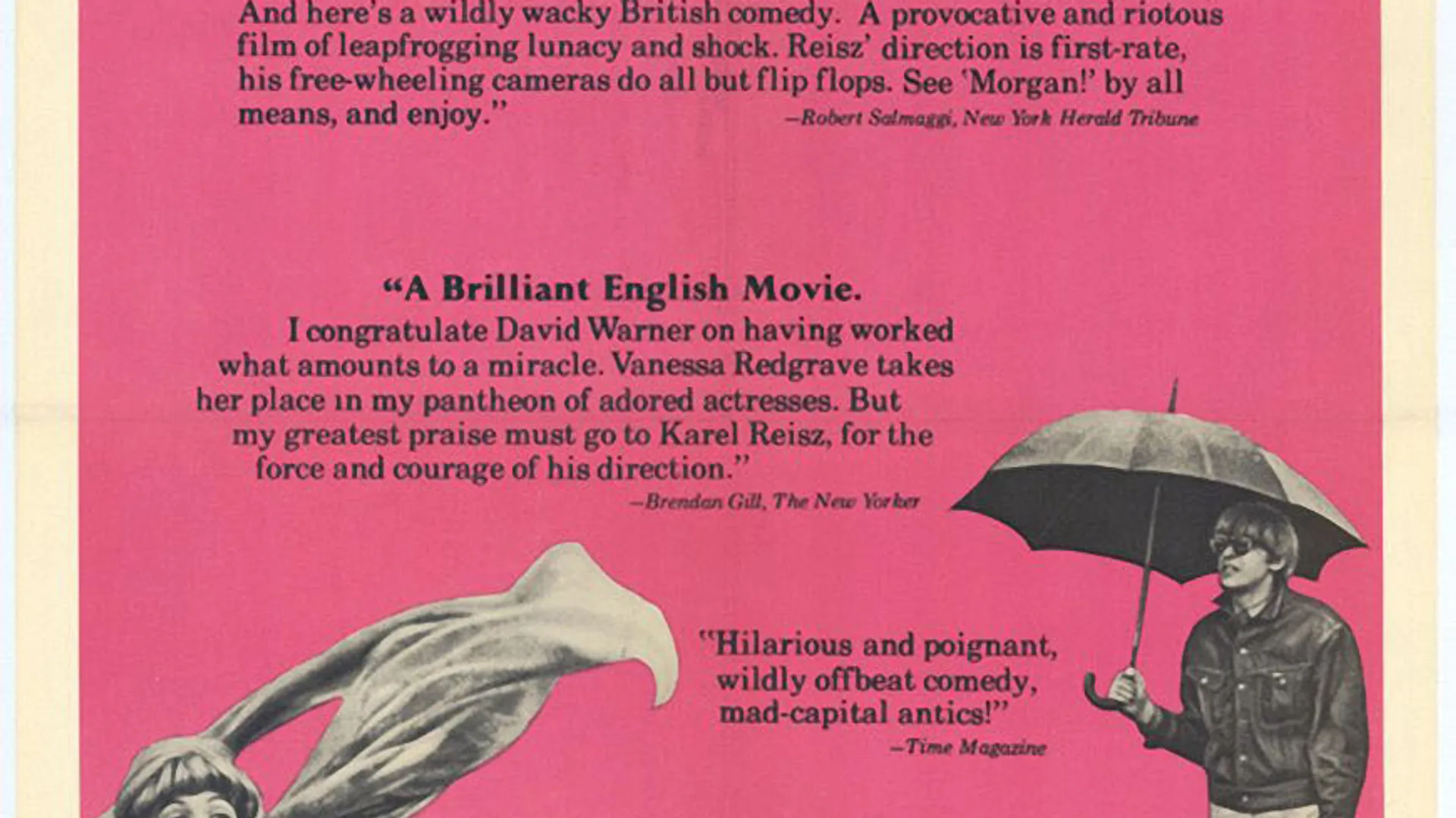 Een juweeltje dat buiten de gebaande paden treedt. Kunstenaar Warner wordt naar de rand van de waanzin gedreven doordat echtgenote Redgrave zich van hem laat scheiden. Dit zet hem aan tot excentrieke escapades. Ook bekend als MORGAN!