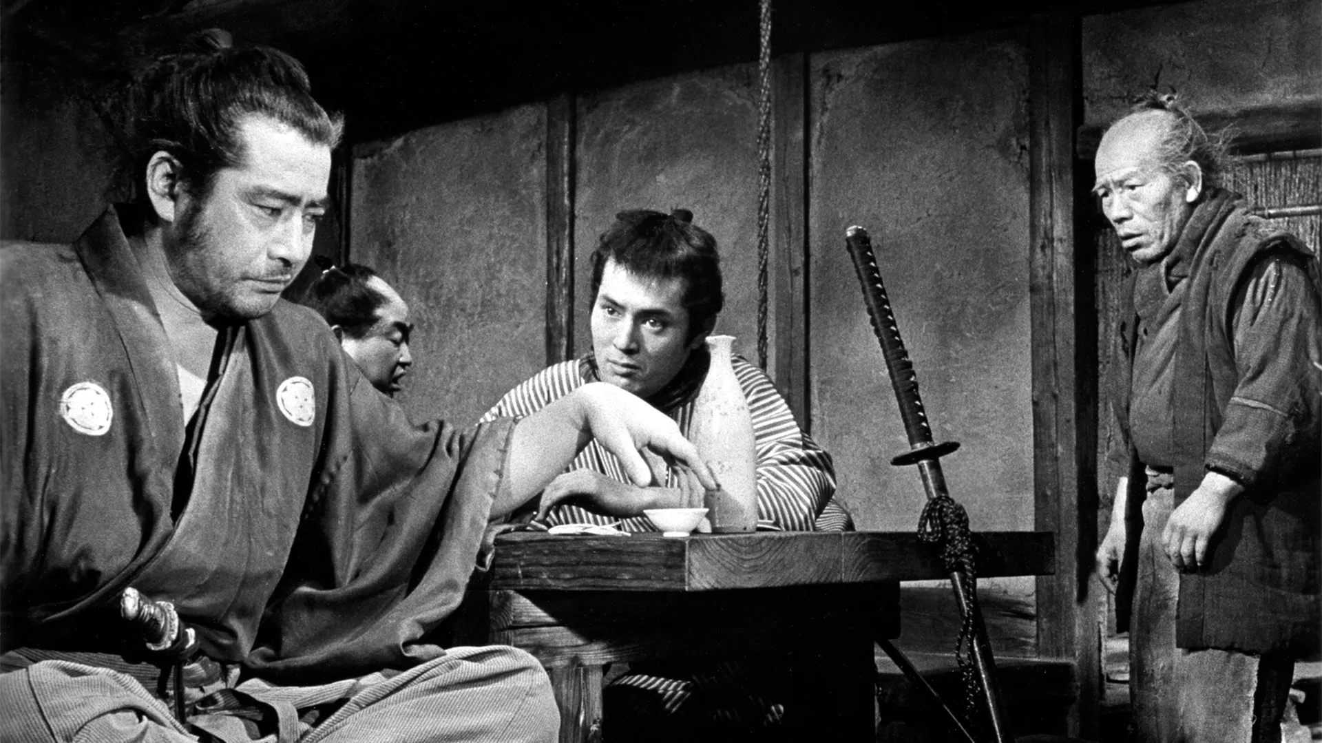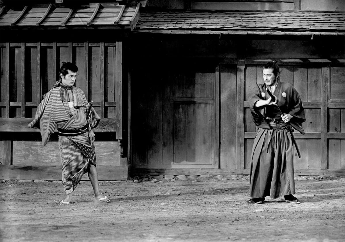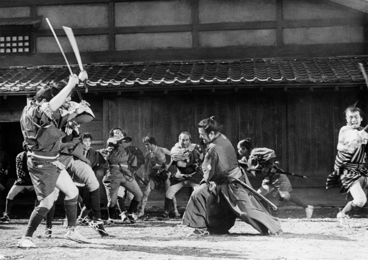 Een ronin (=een samoerai zonder meester) arriveert in een 19de-eeuws dorp, waar hij listig zijn vechtkunsten inzet om twee lokale misdaadbazen tegen elkaar op te zetten. Sterk beïnvloed door de Amerikaanse westerns die Kurosawa in zijn jeugd zag, maar ook weer van grote invloed op alle westerns die na Yojimbo kwamen. Zo wordt de verhaallijn in de film door Sergio Leone een paar jaar later vrijwel letterlijk overgenomen voor diens zeer succesvolle spaghettiwestern A Fistful of Dollars (1964). Wat zal uitdraaien op een door Kurosawa gewonnen rechtszaak, die hem uiteindelijk – zo grapte de Japanse regisseur later – veel meer zou opbrengen dan wat ie aan Yojimbo had verdiend.