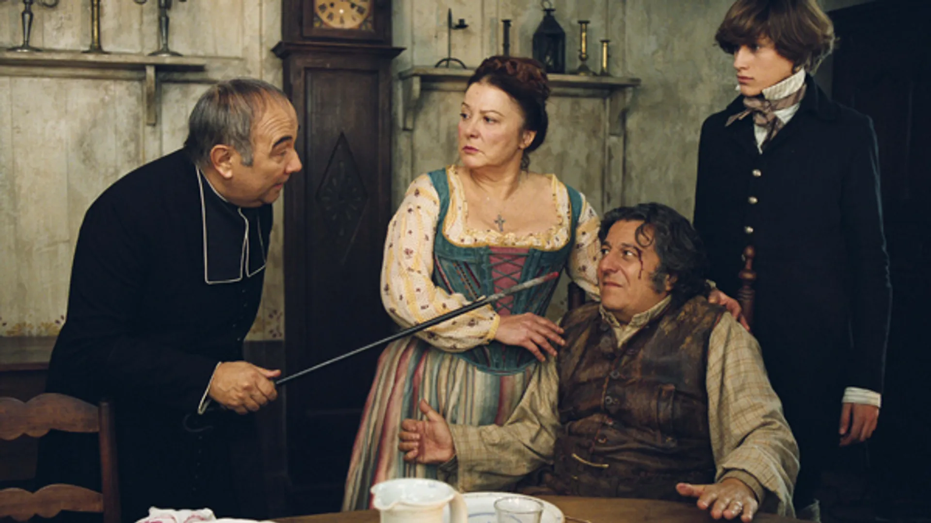 In het dorp Peyrebeille in de Ardèche werden in 1833 een herbergiersechtpaar en hun knecht geguillotineerd voor de roofmoord op een gast. Een en ander nam in de folklore groteske grand guignol-vormen aan en was aanleiding tot romans en verfilmingen. Deze in ieder opzicht valse kermiskluchtversie haalt het niet bij de inktzwarte komedie van Claude Autant-Lara uit 1951 met Fernandel. Ook de immer aimabele Jugnot - in de Fernandel-rol van geestelijke - is kansloos in deze tijd- en talentverspiller. De oorspronkelijke '(bloed)rode herberg' is tegenwoordig een toeristenattractie/museum.
