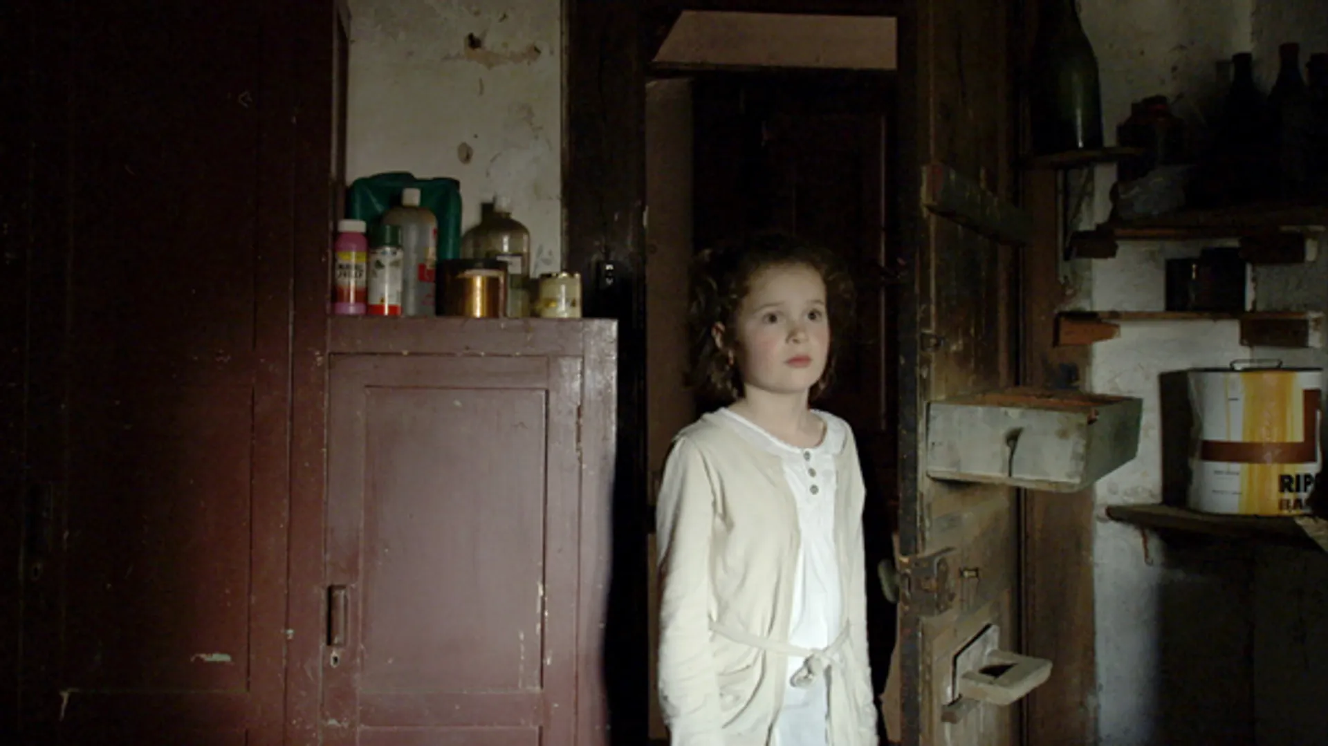 ‘En God zeide: er zij licht; en er was licht.’ Eerst het licht van het lampje op het hoofd van de man die als een mijnwerker in het stof wroet. Dan het daglicht dat in streepjes door de luiken in het duistere huis valt.